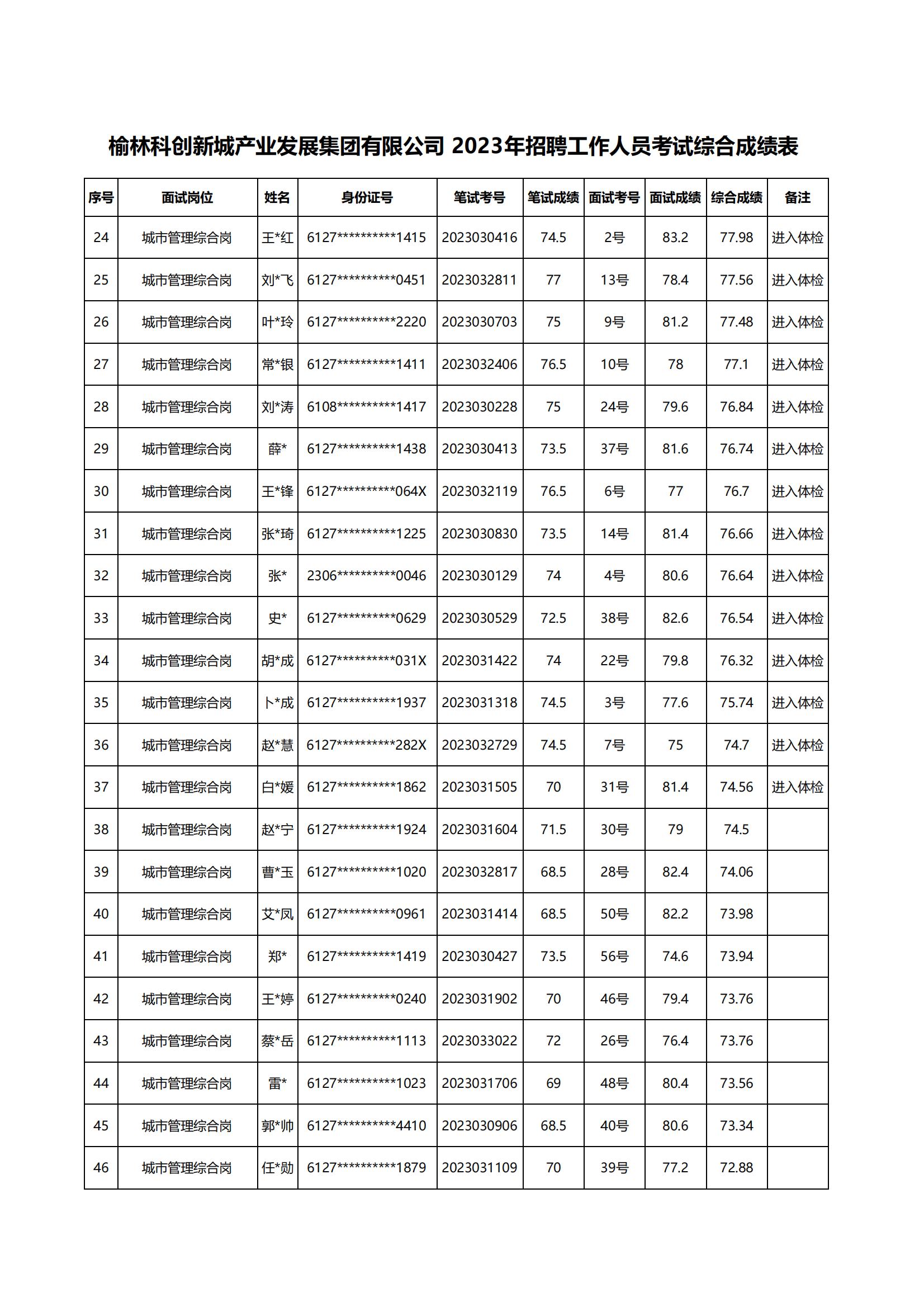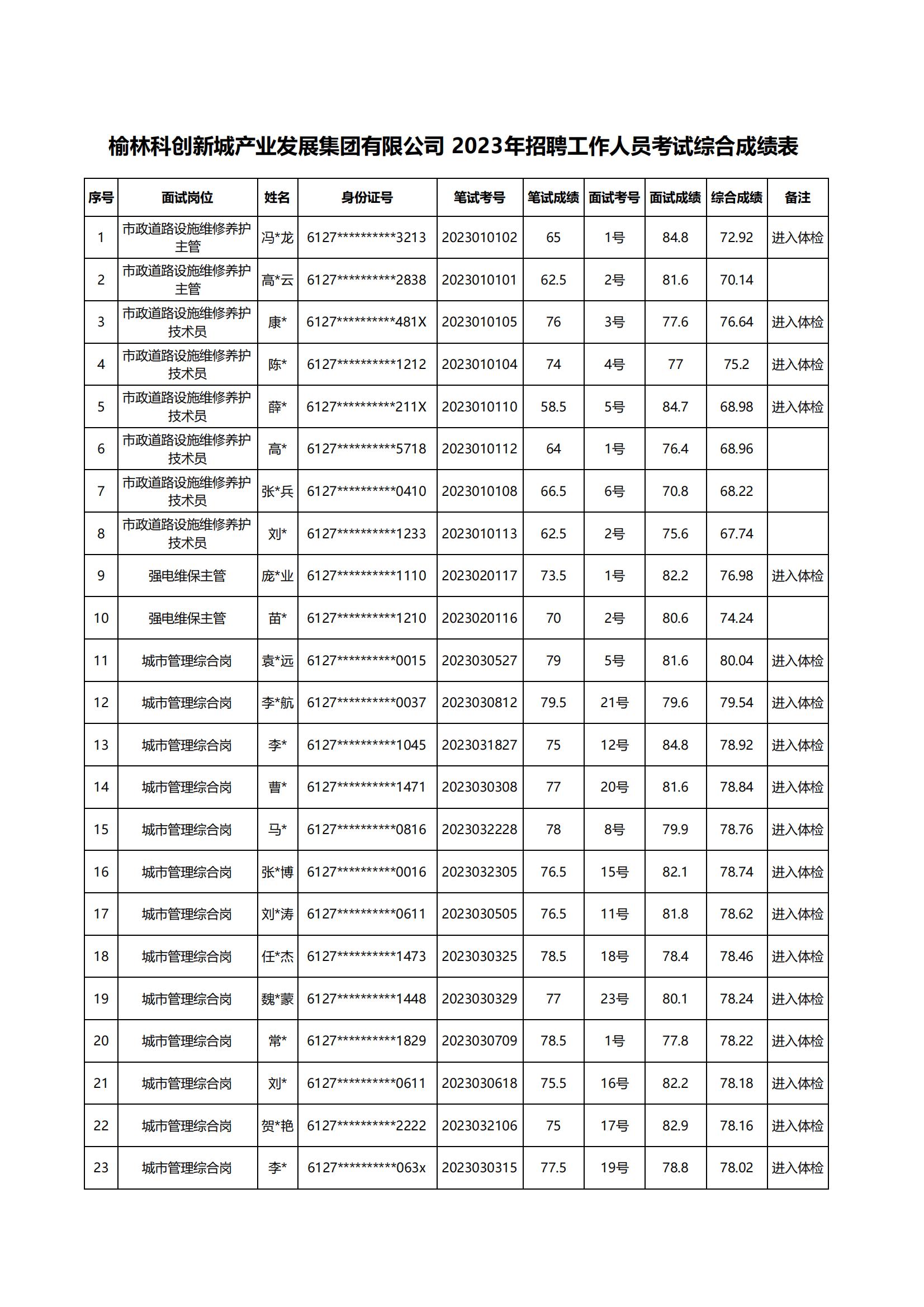 榆林科創(chuàng)新城產(chǎn)業(yè)發(fā)展集團(tuán)有限公司2023年招聘工作人員面試成績、總成績及進(jìn)入體檢人員公示