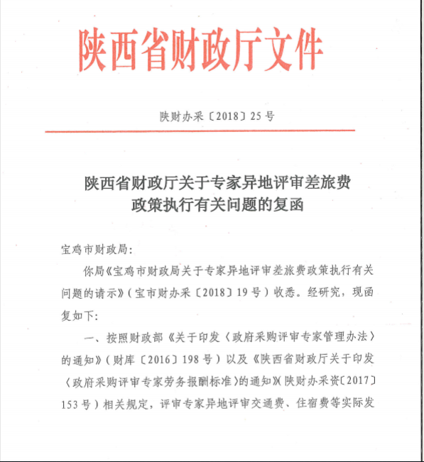 陜西省財(cái)政廳關(guān)于專家異地評(píng)審差旅費(fèi)政策執(zhí)行有關(guān)問題的復(fù)函