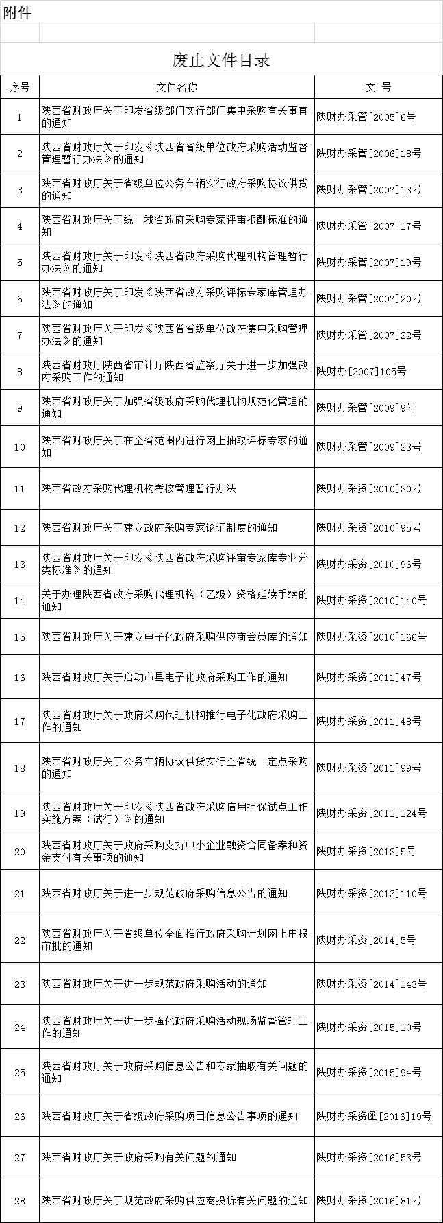 為進(jìn)一步規(guī)范政府采購(gòu)行為,加強(qiáng)政府采購(gòu)監(jiān)督管理工作,根據(jù)《政府采購(gòu)法》及相關(guān)法律規(guī)定,我廳對(duì)2005年以來(lái)政府采購(gòu)有關(guān)文件進(jìn)行了梳理,共清理出已過(guò)時(shí)效、已有新文件替代或與上位法相抵觸的文件28個(gè),現(xiàn)予以廢止。