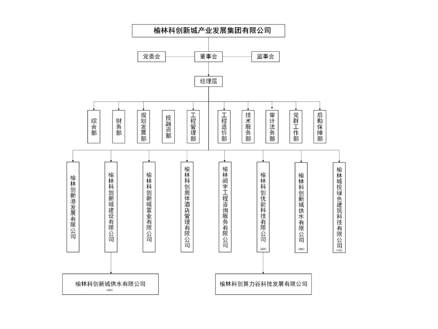 榆林科創(chuàng)新城產(chǎn)業(yè)發(fā)展集團(tuán)有限公司,是根據(jù)《榆林市人民政府關(guān)于組建榆林科創(chuàng)新城產(chǎn)業(yè)發(fā)展有限公司的批復(fù)》(榆政函﹝2019﹞100號(hào))文件精神,由榆林市國(guó)資委(已委托榆林科創(chuàng)新城管委會(huì)代管)、榆林市財(cái)經(jīng)投資管理有限公司、陜西榆林能源集團(tuán)有限公司按7:2:1的比例,共同出資60億人民幣組建的承擔(dān)科創(chuàng)新城開發(fā)建設(shè)、招商引資、投資運(yùn)營(yíng)、專業(yè)化服務(wù)等職能的集團(tuán)公司。目前公司擁有榆林科創(chuàng)新城建設(shè)有限公司、榆林創(chuàng)新港發(fā)展有限公司、榆林科創(chuàng)新城置業(yè)有限公司、榆林科創(chuàng)奧體酒店管理有限公司等4個(gè)全資子公司,參股榆林城投綠色建筑科技有限公司(占股15%),與榆林市水務(wù)集團(tuán)合資組建了榆林科創(chuàng)新城供水公司(占股49%),控股榆林科創(chuàng)優(yōu)能科技有限公司(占股60%),控股榆林科創(chuàng)算力谷發(fā)展有限公司(科創(chuàng)優(yōu)能占股100%)